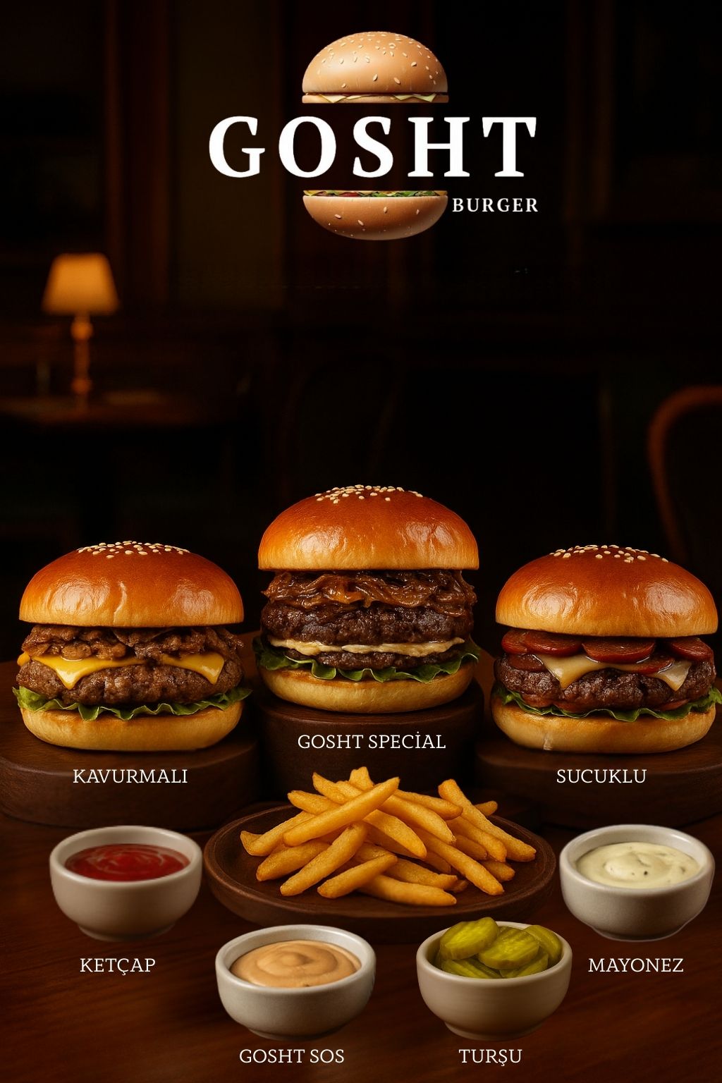 150 gr. dana burger eti, susamlı brioche ekmeği, 2 adet erimiş cheddar peyniri, özel sos, közlenmiş patlıcan, karamelize soğan, közlenmiş kapya biber. Çıtır patates kızartması, ketçap, mayonez, Gosht special sos, turşu, jalapeno biberi ile